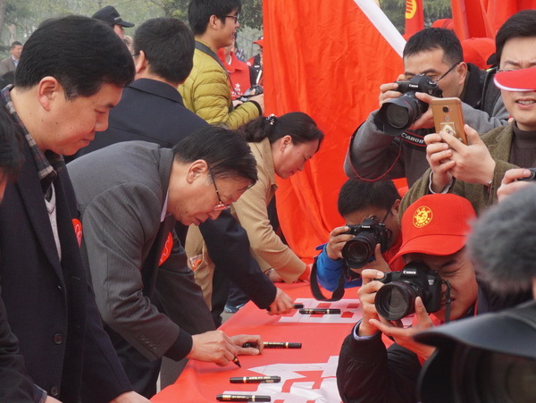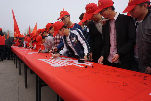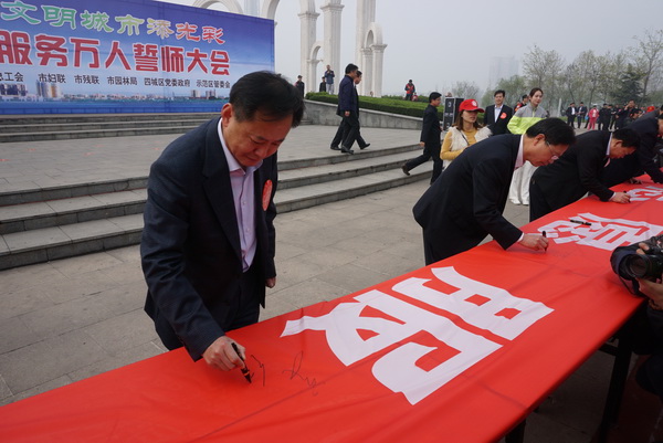 活动结束后,市领导及志愿者在活动条幅上签字。