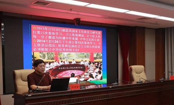 为了充分调动党员干部参与社会主义核心价值观教育实践活动的积极性和主动性,着力加强党员干部思想道德建设和培养社会主义新风尚,引导机关党员干部更加全面的认识中华传统文化,7月4日下午,市纪委监委邀请河南省国学文化促进会副会长、河南网络电视台“国学频道”讲师团团长许建国老师作了题为《植根中华文化 播种幸福人生》的社会主义核心价值观专题宣讲,市纪委监委班子成员、机关和派驻机构全体干部110余人参加讲座。